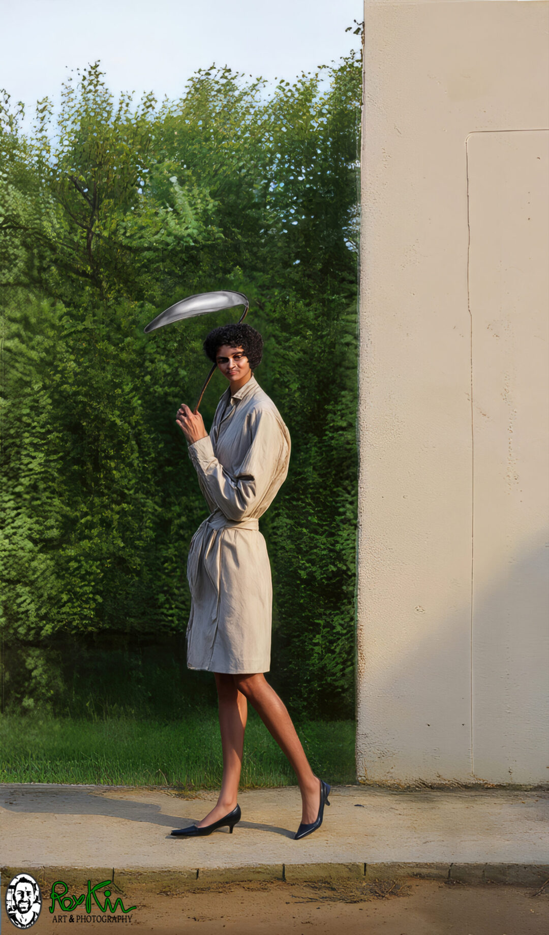 Details: 4 AI’s with many steps and editing. Date: Nov 7, 2025. Source: “Woman Walking in The Street Holding Parasol” The idea behind the original drawing, that this AI adaptation is based upon, was to create and elegant woman who walks in the street and holding a parasol. I guess I chose a curly hair…