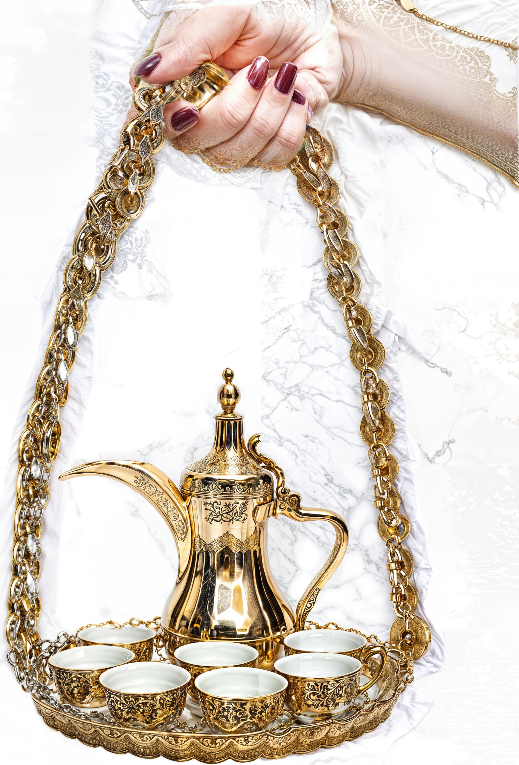 along side Arabic coffee cups and tray ——