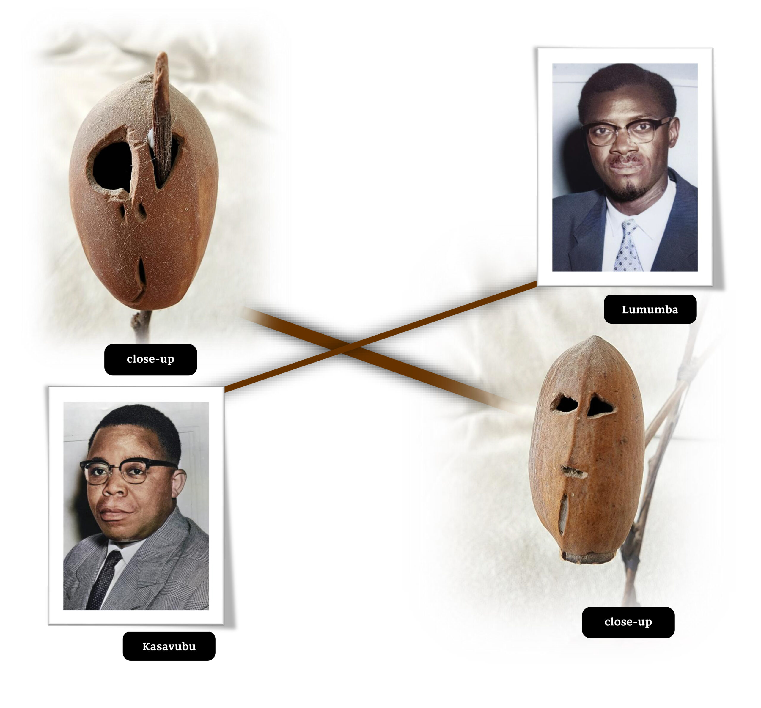 In relation to the name that my father gave to the work (about these two figures) of “Lomumba & Kasabubu” (Hebrew: “לוֹמוּמְבָּה + קָזָבּוּבּוּ”) there is a slight distortion of language and hearing in relation to the true form (in French) in which their names should be pronounced – As shown on the title as “Lumumba and Kasavubu” (Hebrew: “לוּמוּמְבָּה וקָסַא־ווּבוּ [קָסַאווּבוּ]”). Apparently my father read an article about them in a newspaper or heard news and there they said and wrote them distortedly.