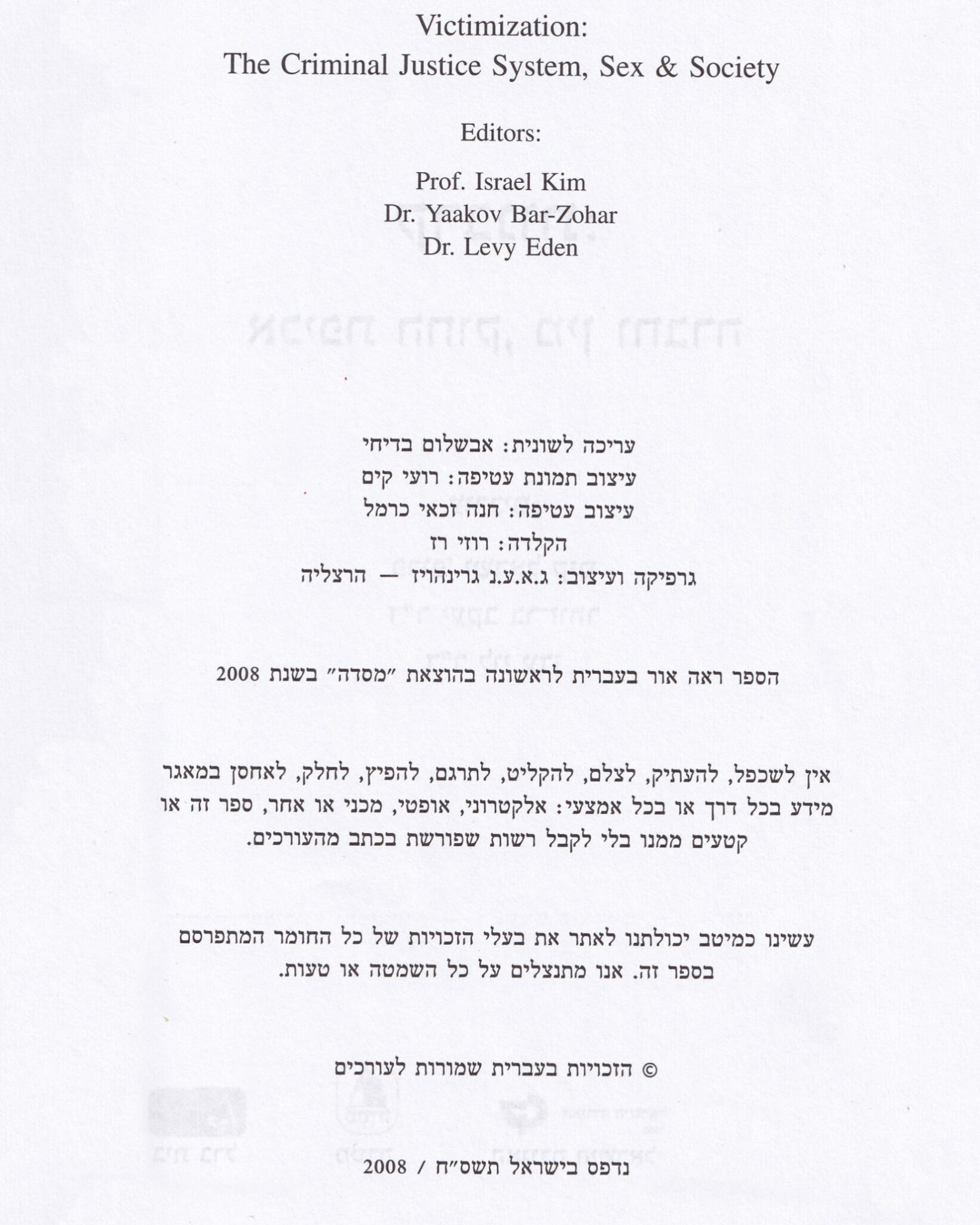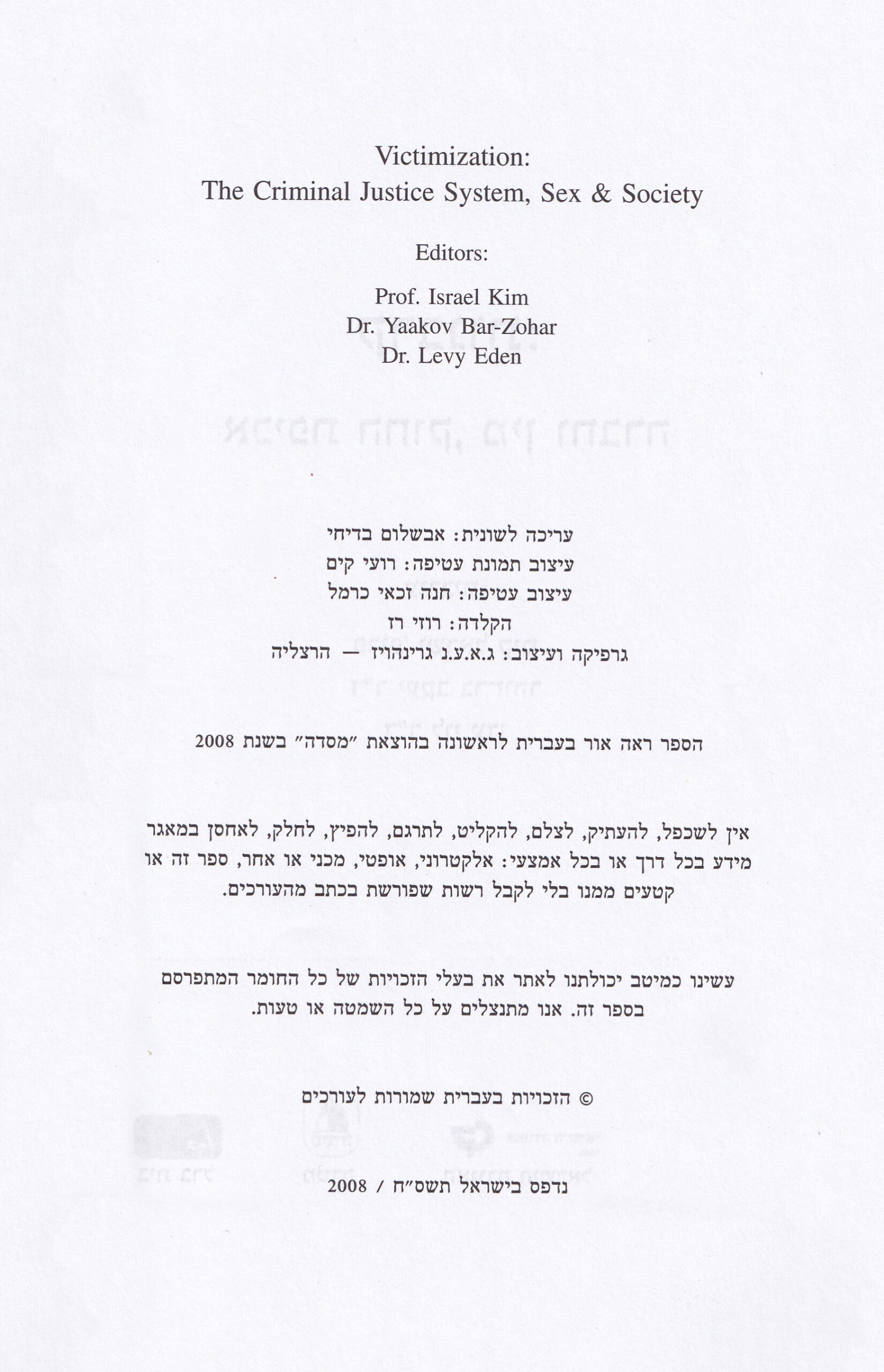 Kim, I., Bar-Zohar, Y. & Eden, L. (Eds.) (2008). Victimization- Criminal Justice, Sex & Society. Massada: Tel-Aviv.